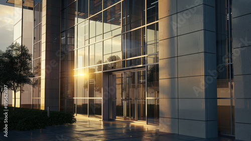 A modern office building basks in the warm glow of the setting sun, showcasing its sleek glass façade and urban chic design.