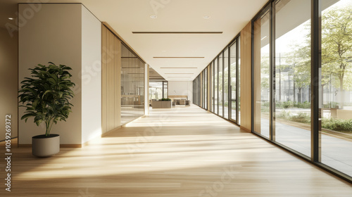 A modern office building with an empty hallway. The spacious office has big windows and bright lighting.