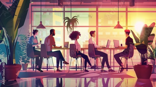 A modern office environment featuring diverse professionals collaborating and working on laptops amidst a backdrop of indoor plants and city views through large windows.