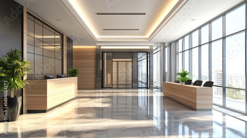 A modern office lobby with a glass wall, wooden furniture, and a large window.