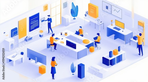 A modern office space featuring collaborative workstations, digital displays, and vibrant decor, emphasizing productivity and teamwork.