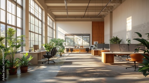 A modern office space featuring large windows, plants, and contemporary furniture, creating a bright and inviting work environment.