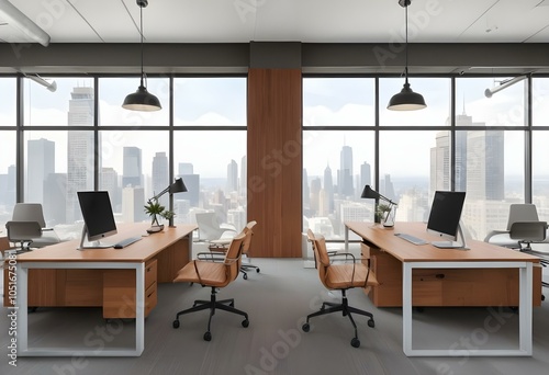 A modern office space with large windows overlooking a city skyline. The room has two desks with office chairs, wooden accents, and industrial-style pendant lights.