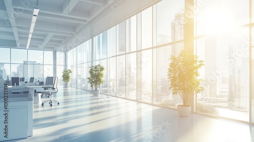 A modern office space with large windows, plants, and a bright atmosphere, promoting a productive work environment.