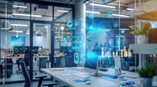 A modern office space with virtual assistants aiding in hightech business decisionmaking