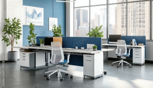 A modern office with a blue wall and a view of the city. The office has a blue partition separating the desks. There are several potted plants in the office, including one in the foreground