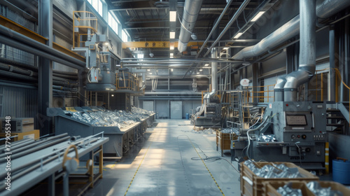 A modern plastic recycling plant with sorting machines and shredders, momentarily paused but ready to recycle plastic waste into reusable materials