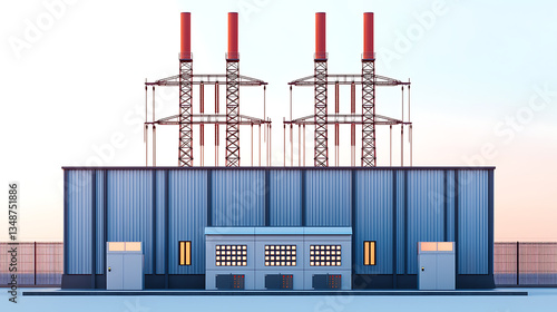A modern power station featuring multiple smokestacks and a sleek design, set against a gradient sky.
