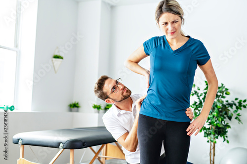 A Modern rehabilitation physiotherapy man at work with woman client working on hip