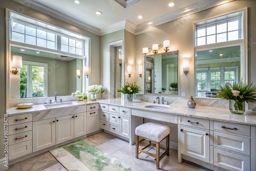 A modern renovated bathroom features a chic cosmetic station with marble countertops, sleek cabinetry, and elegant