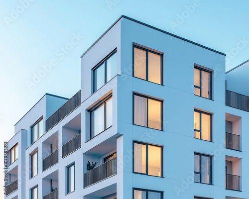 A modern residential building with large windows and balconies, reflecting a clear blue sky.