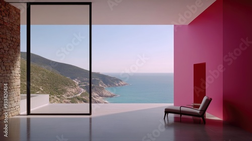 A modern room features a comfortable chair with a blue cushion, overlooking a peaceful beach and calm ocean waters on a sunny day