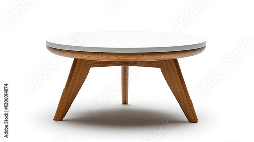 A modern round coffee table with a white top and wooden legs, ideal for living room decor.