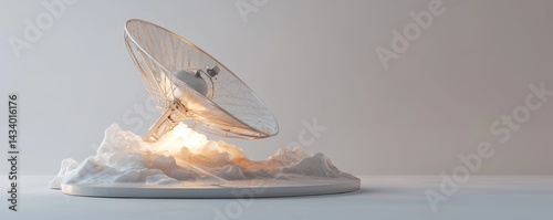 A modern satellite dish model with a glowing light on a minimalist surface.