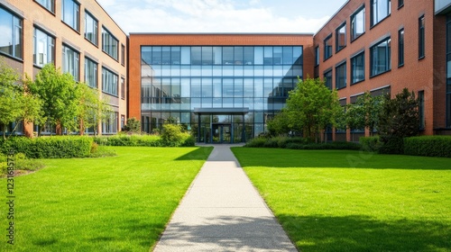 A modern school building with large glass windows and a welcoming entrance, surrounded by green lawn, with plenty of copy space