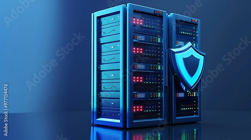 A modern server setup with a digital shield symbolizing cybersecurity and data protection in a high-tech environment.