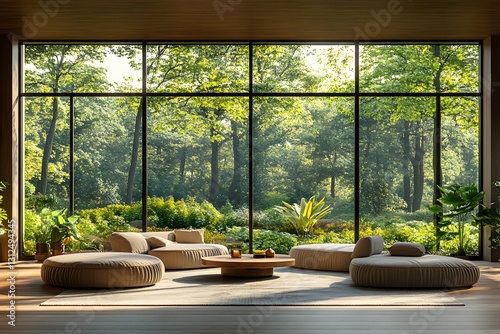 A modern, simple living room with large windows overlooking a lush garden, evoking calm and sustainability. Perfect for ads or articles on eco-friendly living and minimalist interior design.