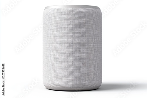 A modern smart speaker with a sleek cylindrical design and touch controls displayed on a solid white background, single object