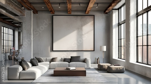 A modern, spacious living room with large windows, exposed beams, and minimalist furniture creates a serene atmosphere.