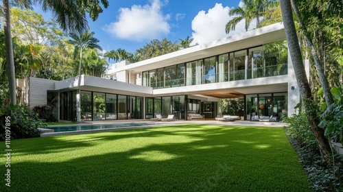 A modern, spacious L-shaped home featuring a white-gray facade, tall glass windows, and a lush green lawn