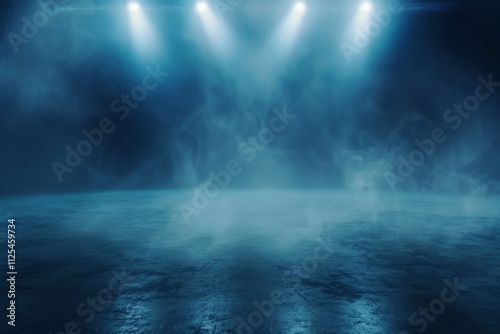 A modern studio space showcases an ethereal ambiance with floating smoke above a dark blue cement floor.