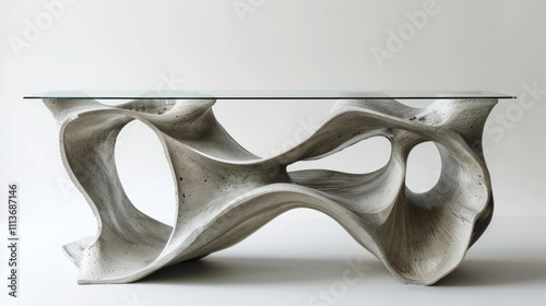 A modern table featuring an artistic, sculptural base with a glass top.