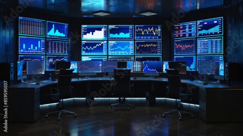 A Modern Trading Room with Multiple Screens Displaying Stock Market Data