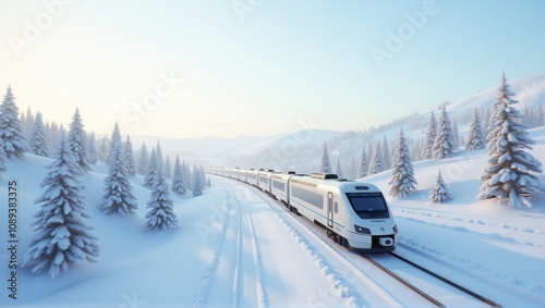 A modern train moves through a snowy landscape with pine trees under a clear sky. Generative, AI,