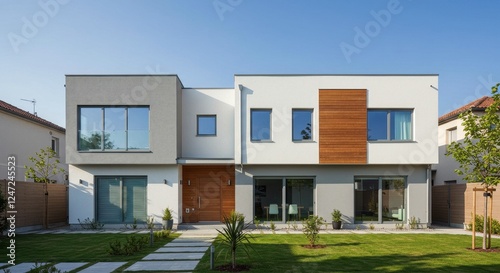 A modern two story house with a mix of white and gray plaster walls and wooden accents