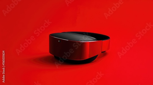 A modern VR headset sitting on a vibrant red background, offering a bold and dynamic setting for tech-themed projects.