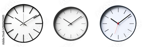 A modern wall clock with a minimalist design, featuring clean lines and simple numerals, isolated on transparent background