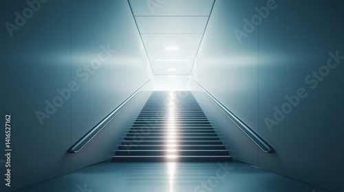 A modern, well-lit staircase leads to a bright opening, creating a sense of depth and perspective in a sleek architectural space.