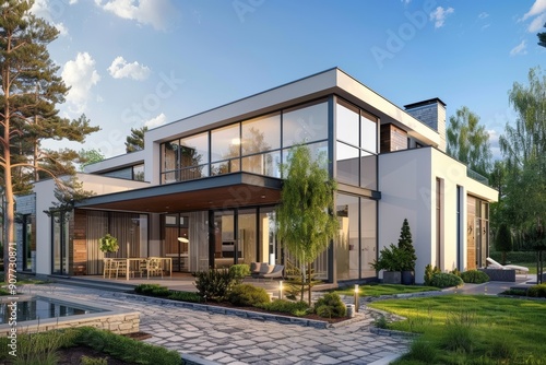 A modern, white house with large windows and a stone patio in the front yard