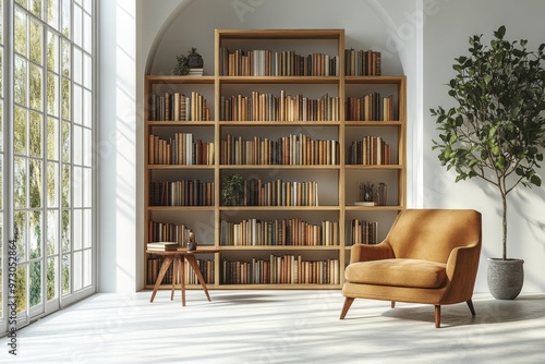 A modern white room with bookshelves, a brown armchair and table on a light background, books in the shelf.