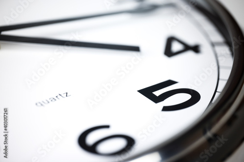 A Modern white wall clock with aluminium frame. Close up to a wall clock, the pointers at quarter pass 4. Selective focus on the number 5 or 5 o'clock. Reflections in the aluminum frame of the watch.