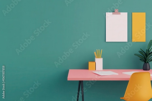 A modern workspace featuring a pink desk, yellow chair, and vibrant teal wall, accentuated by plants and minimalistic decor.