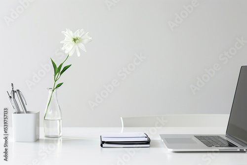 A modern workspace showcases a laptop, a notebook, and a single flower in a glass vase