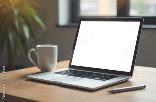 A modern workspace with a laptop, cup of coffee, and pen on a wooden desk by a sunny window in an office setting