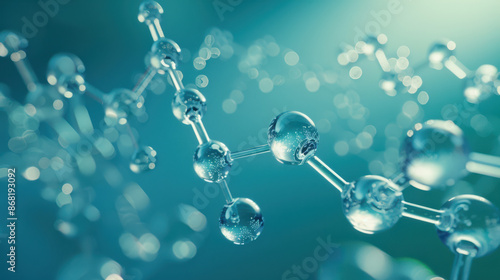 a molecular structure, transparent and glossy spheres connected by thin rods