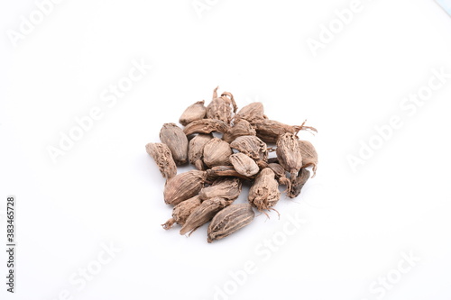 A molehill of a handful of black cardamom scattered on a plain white background.