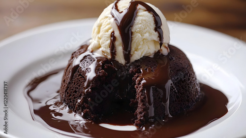 A molten chocolate cake with a gooey center, served with a scoop of vanilla ice cream and a drizzle of rich chocolate ganache for extra indulgence.