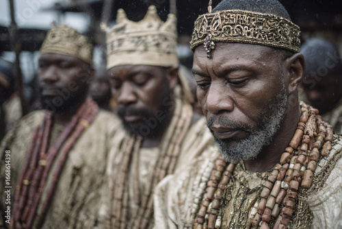 A moment of prayer at the Igogo Festival in Owo. The king and nobles bowing their heads, adorned in beads and flowing gowns, surrounded by attendants.