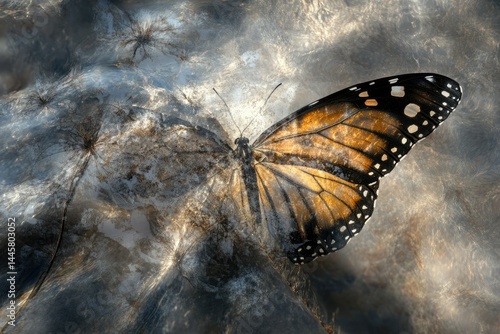 A monarch butterfly in ethereal dandelion seed heads, a dreamy blend of nature's beauty and fragility.
