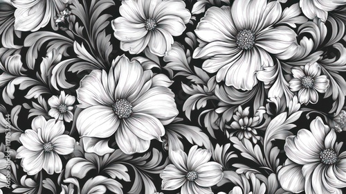A monochromatic floral pattern featuring intricate flowers and leaves on a dark background.