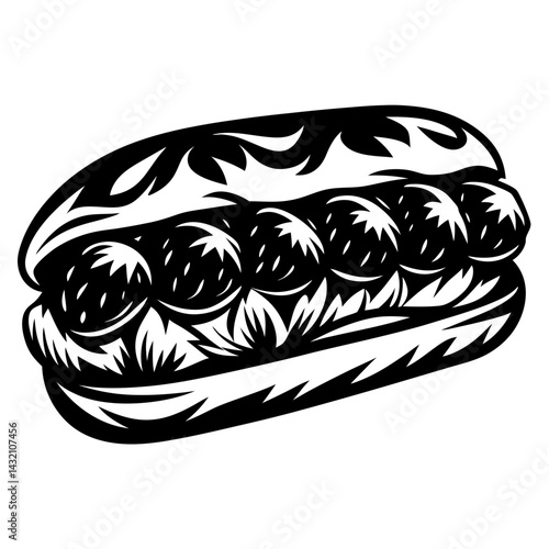 A monochromatic illustration of a meatball sub sandwich with bold outlines