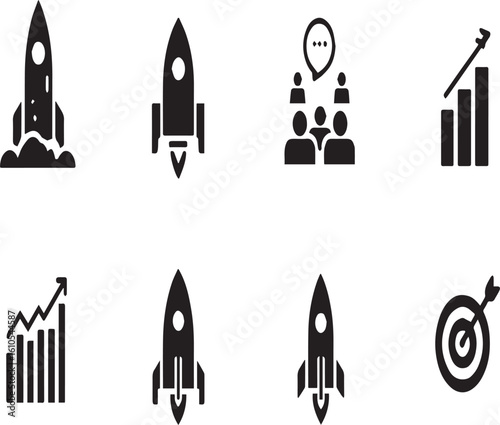 A monochrome depiction of various office supplies including pens laptops and a notepad on white
