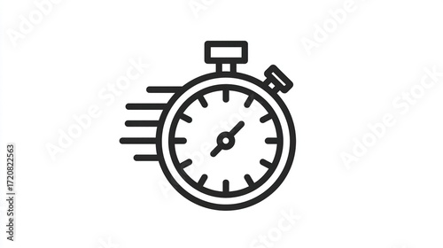 A monochrome line art stopwatch icon, depicting speed with motion lines trailing behind