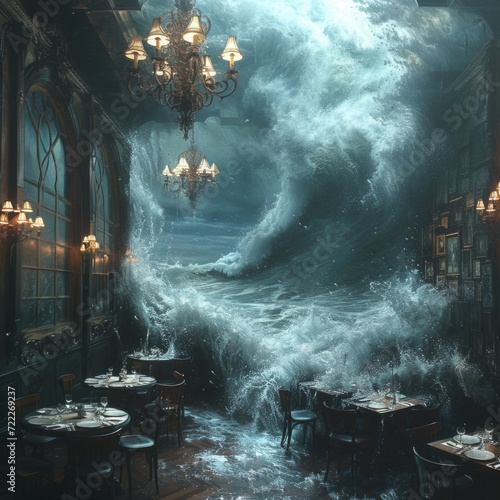 A monstrous ocean wave hit a coastal restaurant, broke through the panoramic glass, the interior was flooded, tables were overturned, a tsunami water destruction scene