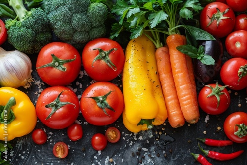 A moody background enhances the vivid reds and greens of a selection of fresh vegetables