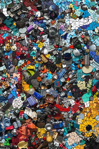 A mosaic made of colorful found objects, including bottle caps, buttons, and pieces of plastic.